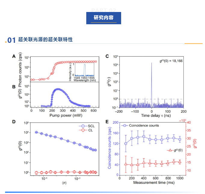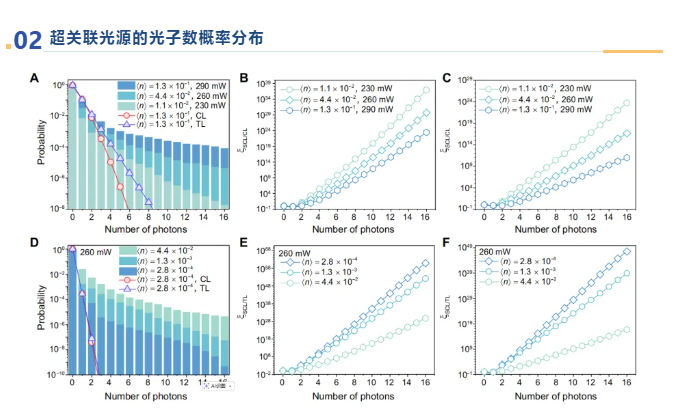图2为超关联光源的光子数概率分布。团队利用星秒MT16的多体符合功能,结合超导纳米线单光子探测器,对超关联光源的光子数概率分布开展研究。实验结果显示,超关联光源具有比经典光源更宽的光子数分布范围和更高的多光子发射概率,当每脉冲平均光子数<n>为2.8×10-4时,在单个脉冲中检测到16光子的概率分别比相干光和热光高60和47个数量级,展现出远超经典光源的多光子发射能力。